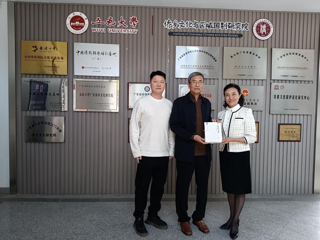 图为张国雄教授向江门市侨联赠送《张国雄自选集》。(右起:林春晖、张国雄、张文正)